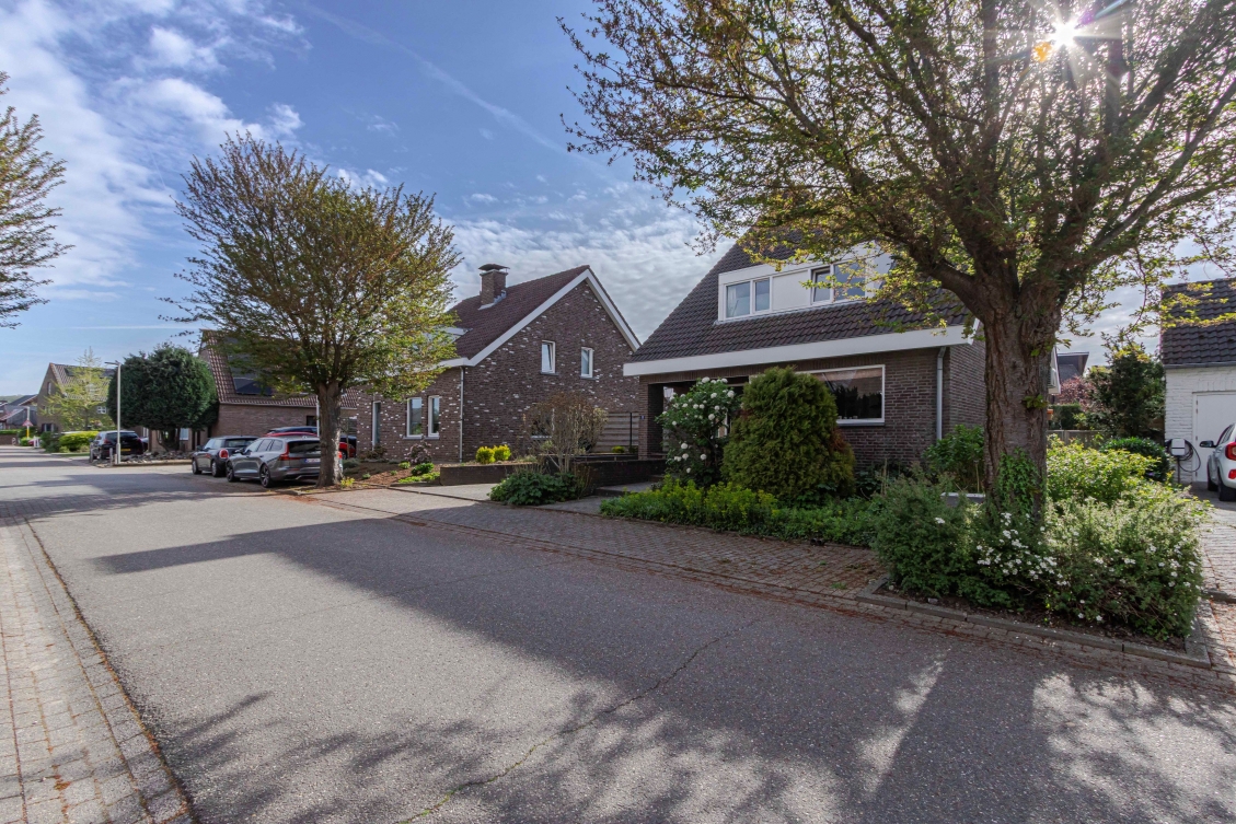 De voortuin is eveneens verzorgd aangelegd, er is een hek aan de rechterzijkant (de achterom), de oprit aan de linker zijde en de entree is deels overdekt.