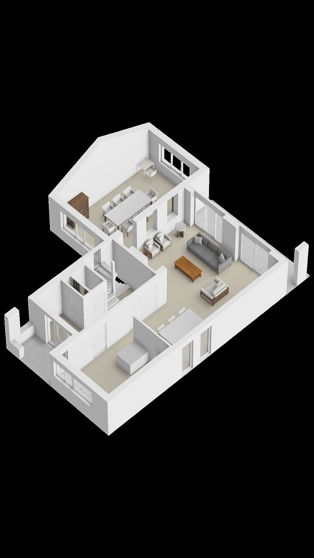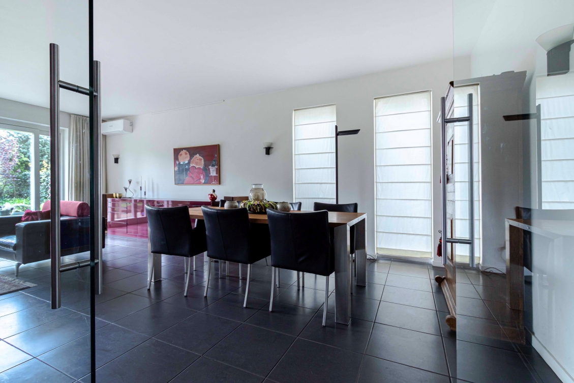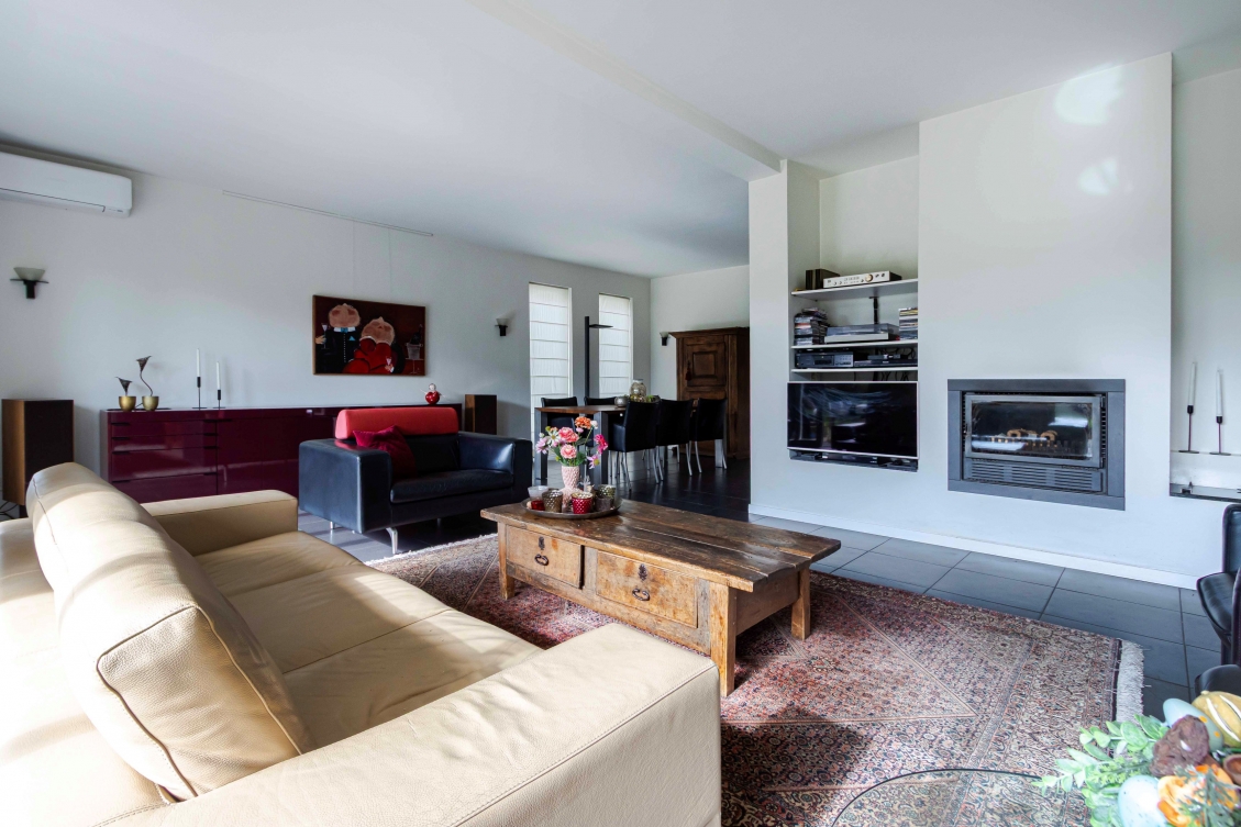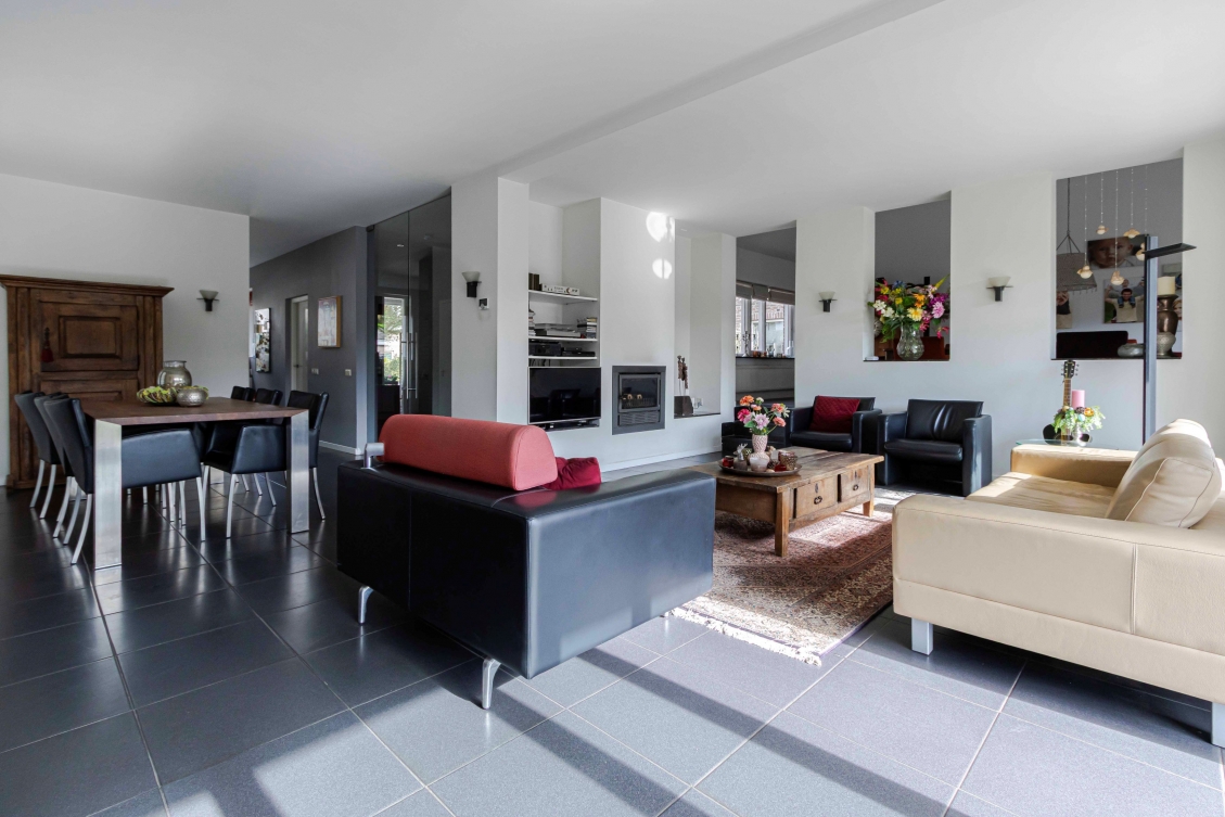 Middels dubbele openslaande glazen deuren van vloer tot plafond komt u in de heerlijk grote woonkamer van in totaal 69m²!! De ruime living bestaat uit 2 gedeelten. Op begane grond niveau is een l-living met een schuifpui aan de tuinzijde en een strakke schouw met ingebouwde houtkachel en grenzend aan de keuken het eetgedeelte. En middels 3 trapjes is het separaat zitgedeelte op +0,60M niveau bereikbaar.