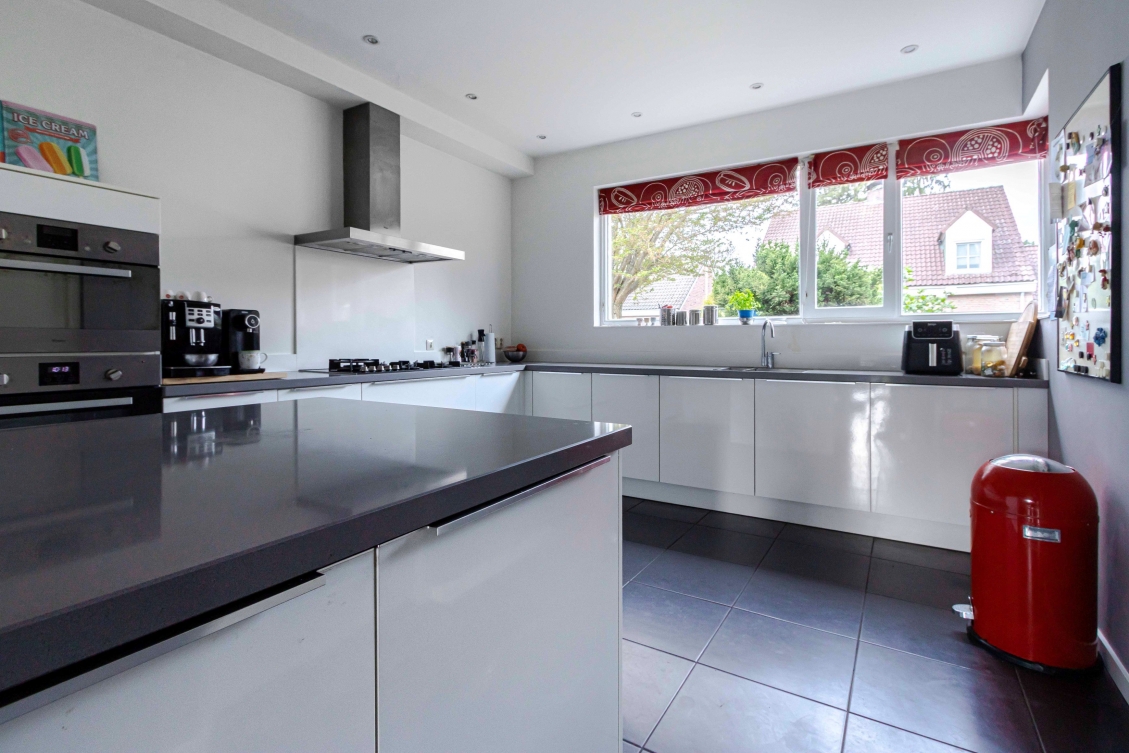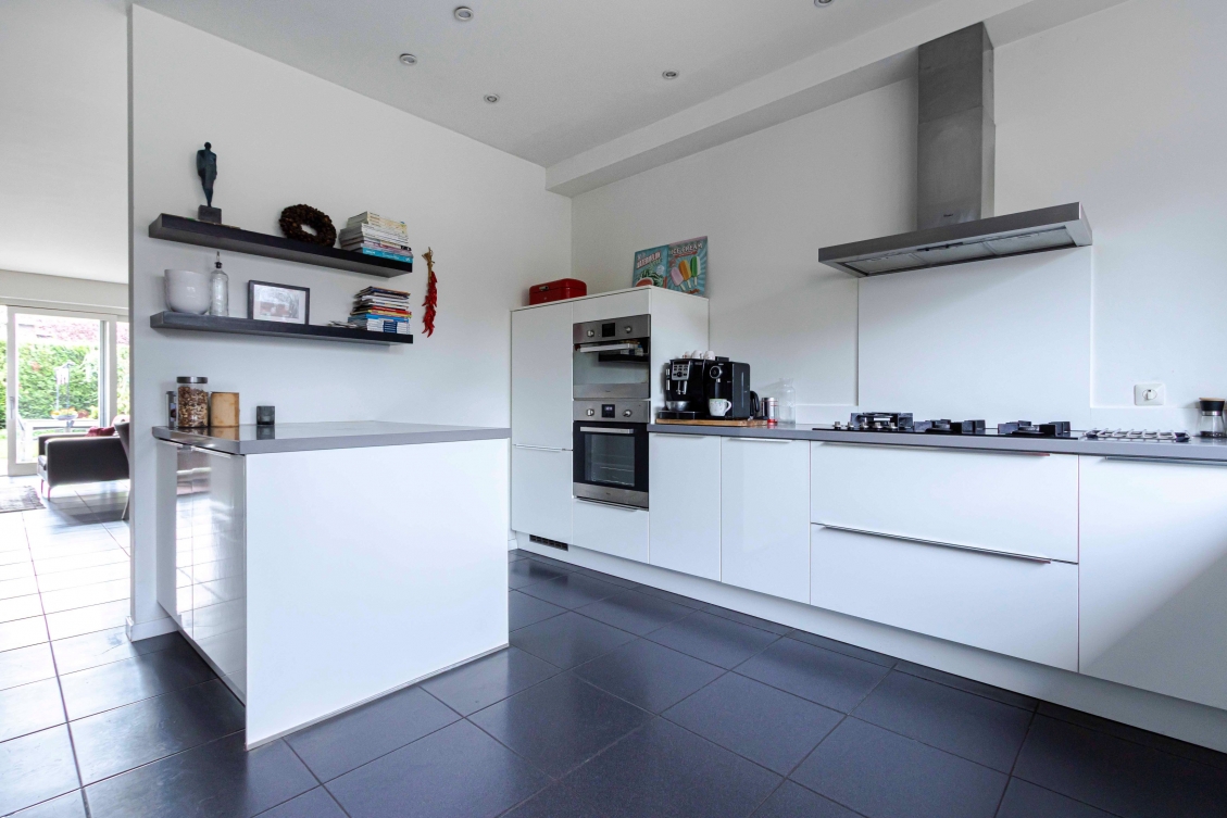 De halfopen keuken is 15m² groot en is gelegen aan de autoluwe straatzijde. De moderne en complete keukeninstallatie is voorzien van onder meer een koelkast, oven, combi-magnetron, 5-pits gaskookplaat, vaatwasser en afzuigkap.