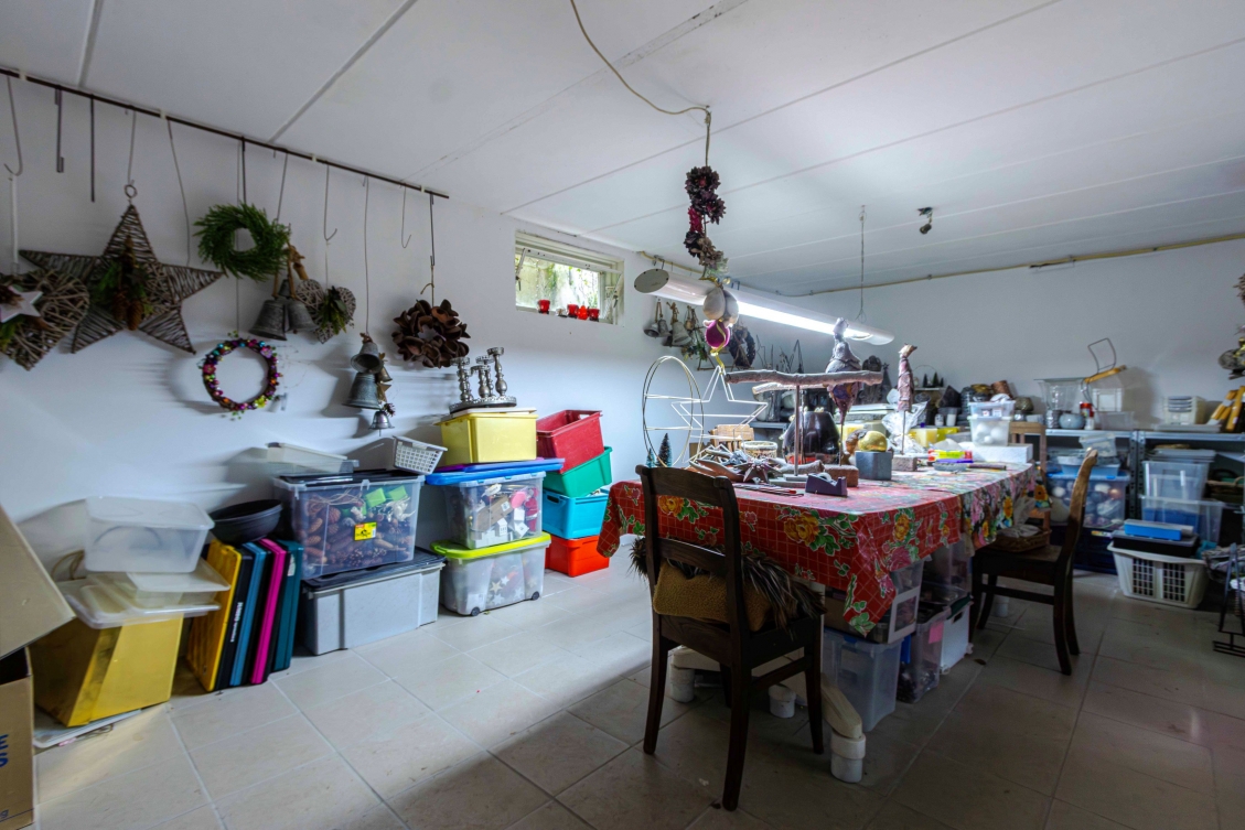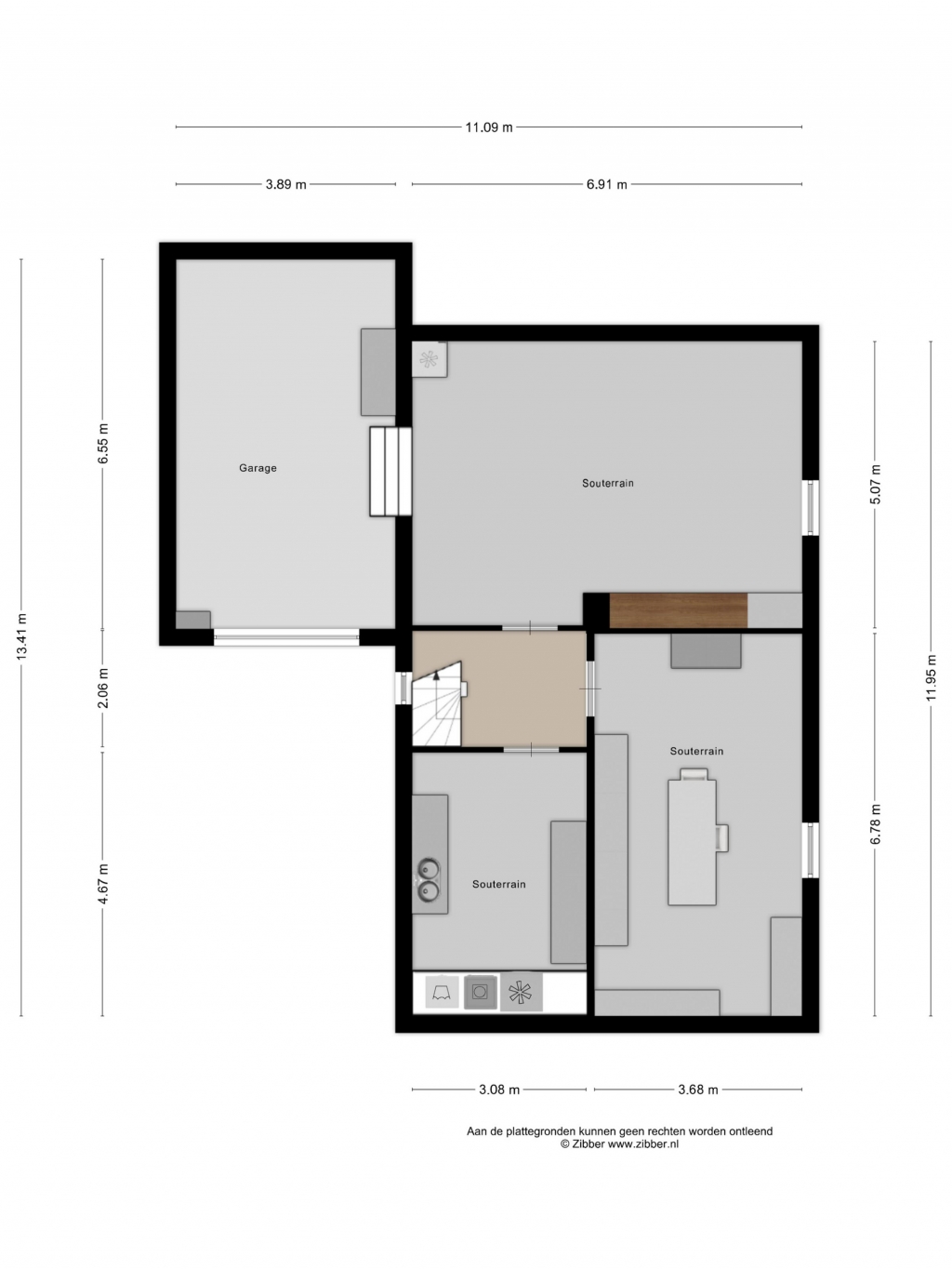 In het grote souterrain is een kelderportaal van ca. 6m², vervolgens de waskelder van 14½m², een hobbykelder van 25m² en nog een ruime kelder geschikt voor opslag/hobby, groot 35m². Deze kelder staat in verbinding met de garage van 25½m². De garage heeft een elektrisch bedienbare poort.