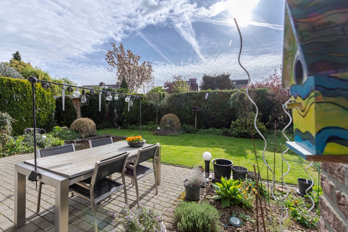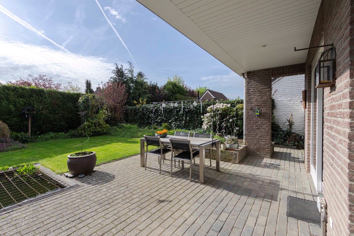 De heerlijke achtertuin op zuid-oost is ca. 170 m² groot. Deze verzorgd aangelegde tuin heeft een deels overdekt terras, een vijverpartij, groen rondom, borders, een gazon, een houtberging en een achterom.